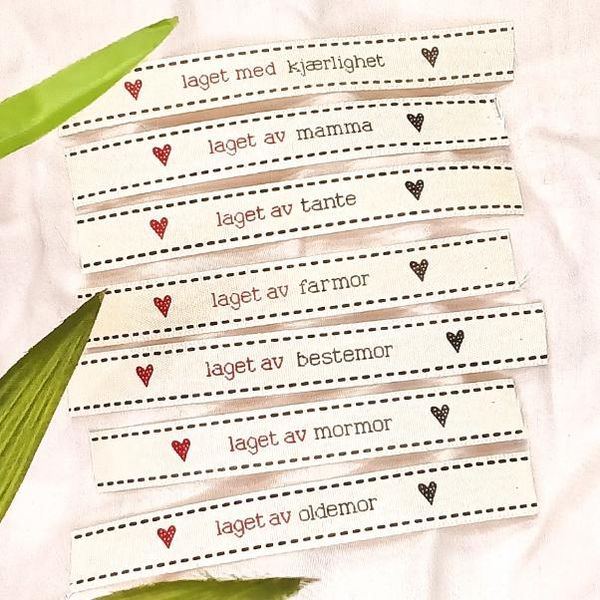 Merkelapper med ulike "laget av" tekster.