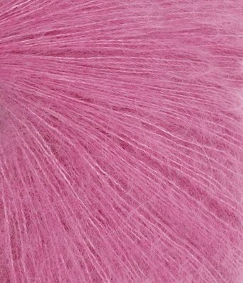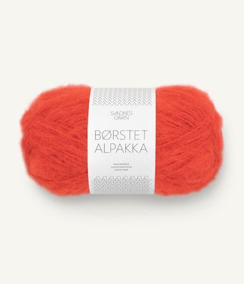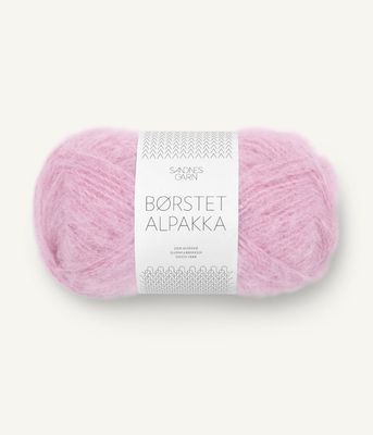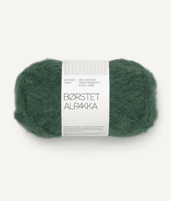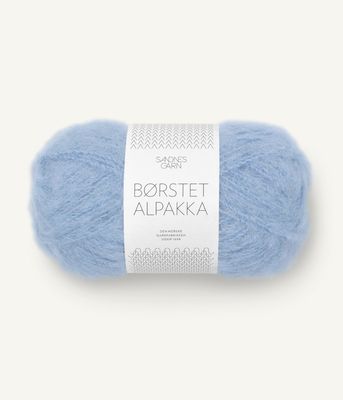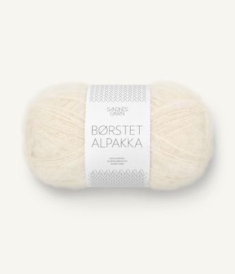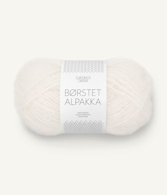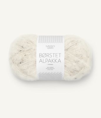 Jakken strikkes ovenfra og ned i halvpatent i Børstet Alpakka og Tynn Silk Mohair